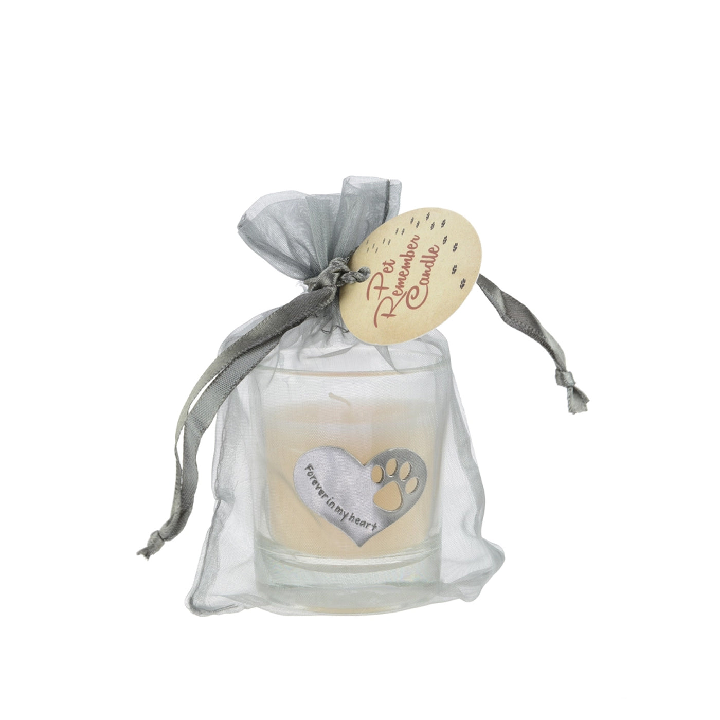 The loss of a beloved pet is one of the hardest things anyone goes through. This mini glass votive candle makes a thoughtful gift for someone who's pet has crossed the Rainbow Bridge. This candle will burn for 10-14 hours and can then be cleaned out for a replacement candle. Each candle is affixed with a pewter heart, reading "Always in my heart." The light of the candle will emit a comforting glow through the paw print cutout on the heart.
